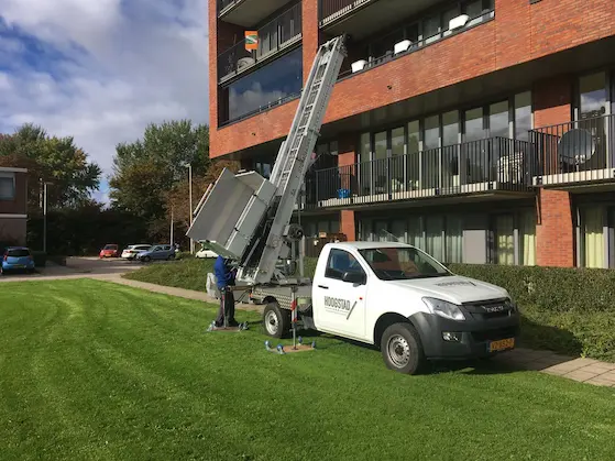 Het is van belang om de verhuislift op een stabiele en veilige plaats neer te kunnen zetten. Dat betekent onder andere dat we de verhuislift tot maximaal 10 meter van de muur af kunnen zetten. We hebben een voorkeur voor een positie zo dicht mogelijk tegen de gevel aan, recht onder het raam of het balkon. Bovendien adviseren we u op voorhand twee parkeerplaatsen hieronder vrij te houden of door contact op te nemen met de gemeente over het eventueel tijdelijk stremmen van het verkeer. Zo kunnen wij zo snel en veilig mogelijk de verhuizing afronden.